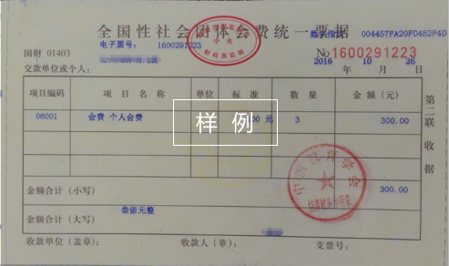 缴费后由我会开具《全国性社会团体会费统一票据》,图示如下: